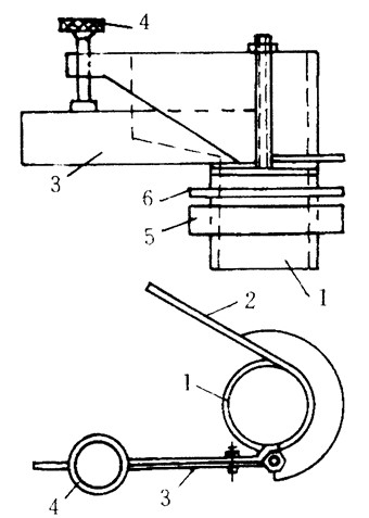 1—排料管;2—固定刮板;3—可動(dòng)刮板;4—壓緊螺釘;5—螺母;6—墊圈